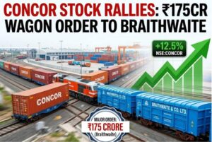 Container Corporation of India (CONCOR) shares rose after announcing a ₹175 crore order to Braithwaite & Co for nine spine car rakes. This investment will strengthen freight capacity, improve logistics efficiency, and support growing demand for rail-based cargo transport. The deal also promotes domestic manufacturing and reflects confidence in future growth of India’s freight sector.